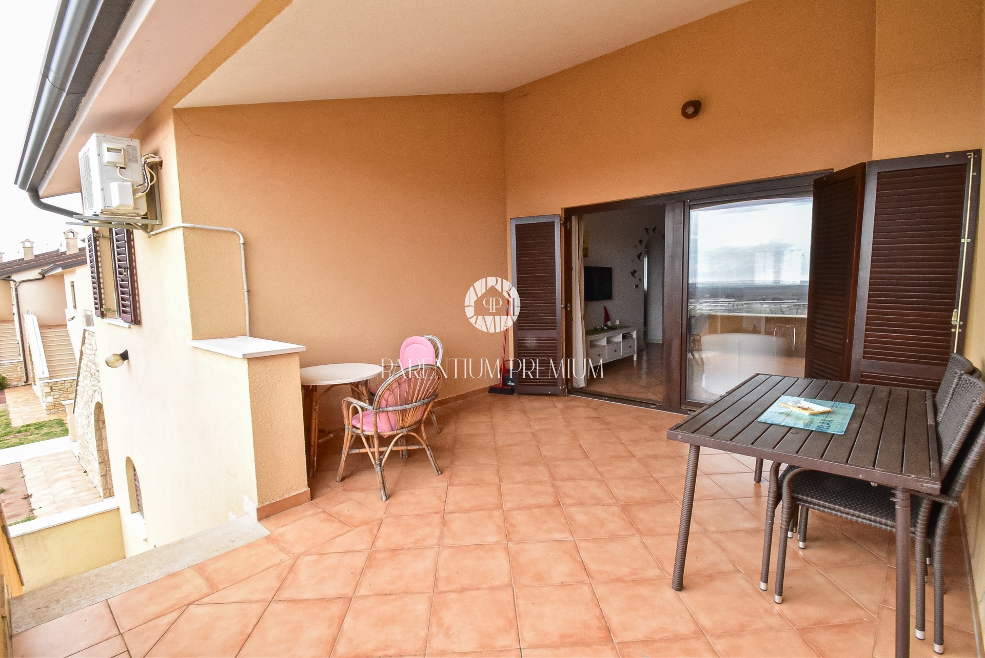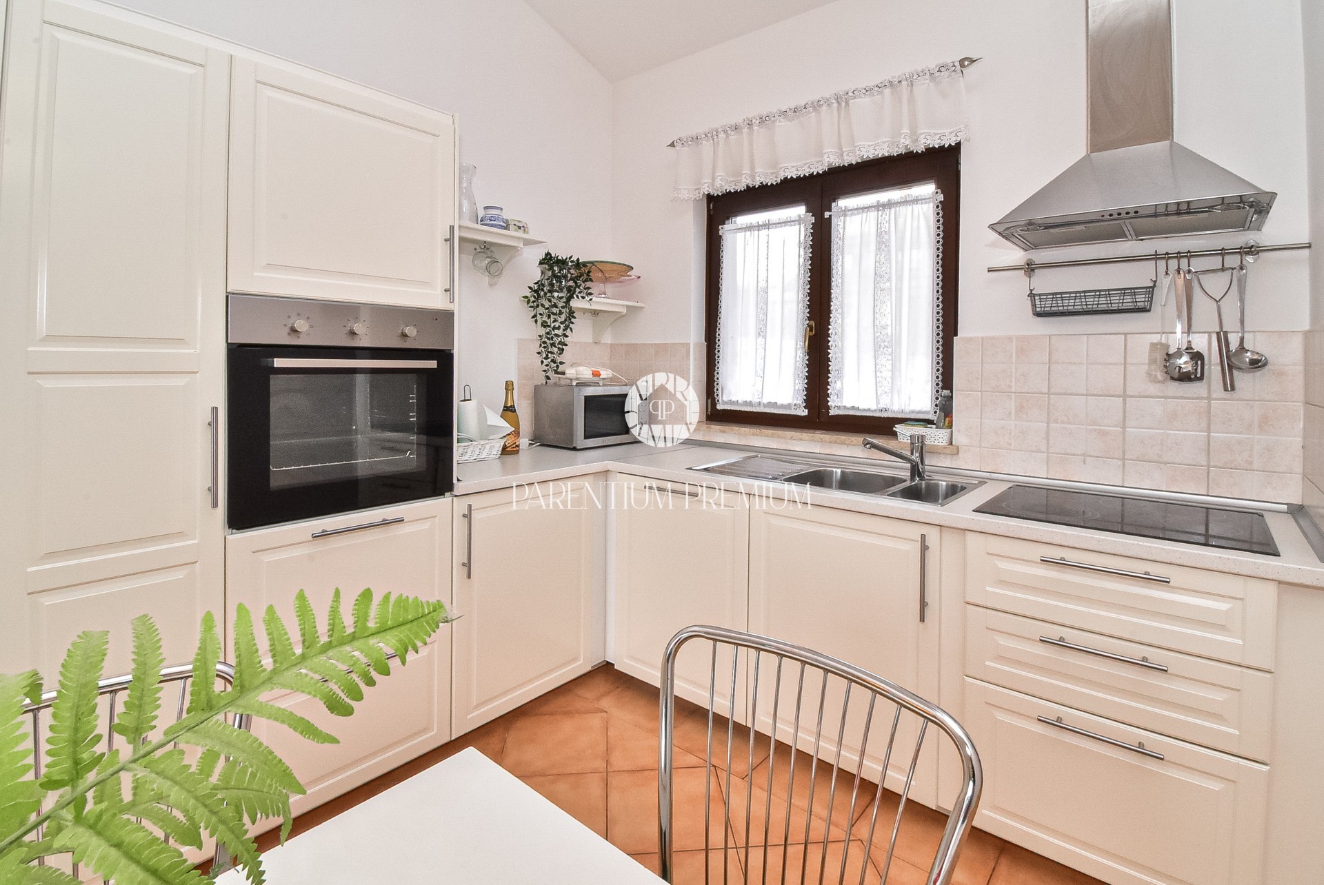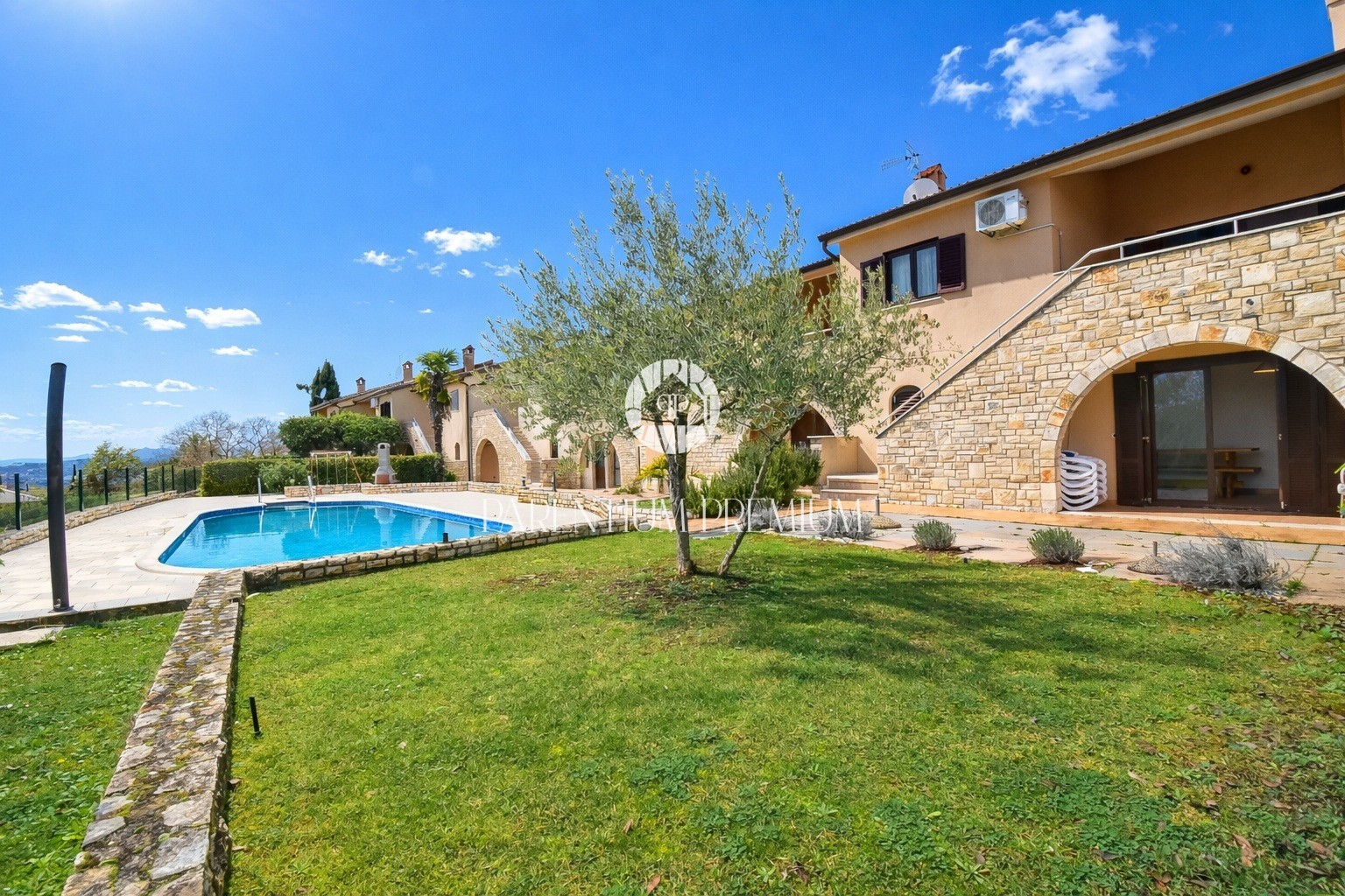 U mirnom i uređenom naselju u okolici Poreč smještena je ova atraktivna kuća u nizu s otvorenim panoramskim pogledom na more i pristupom zajedničkom bazenu, unutar skladnog kompleksa od ukupno devet kuća koje se koriste za privatne potrebe i turistički najam.