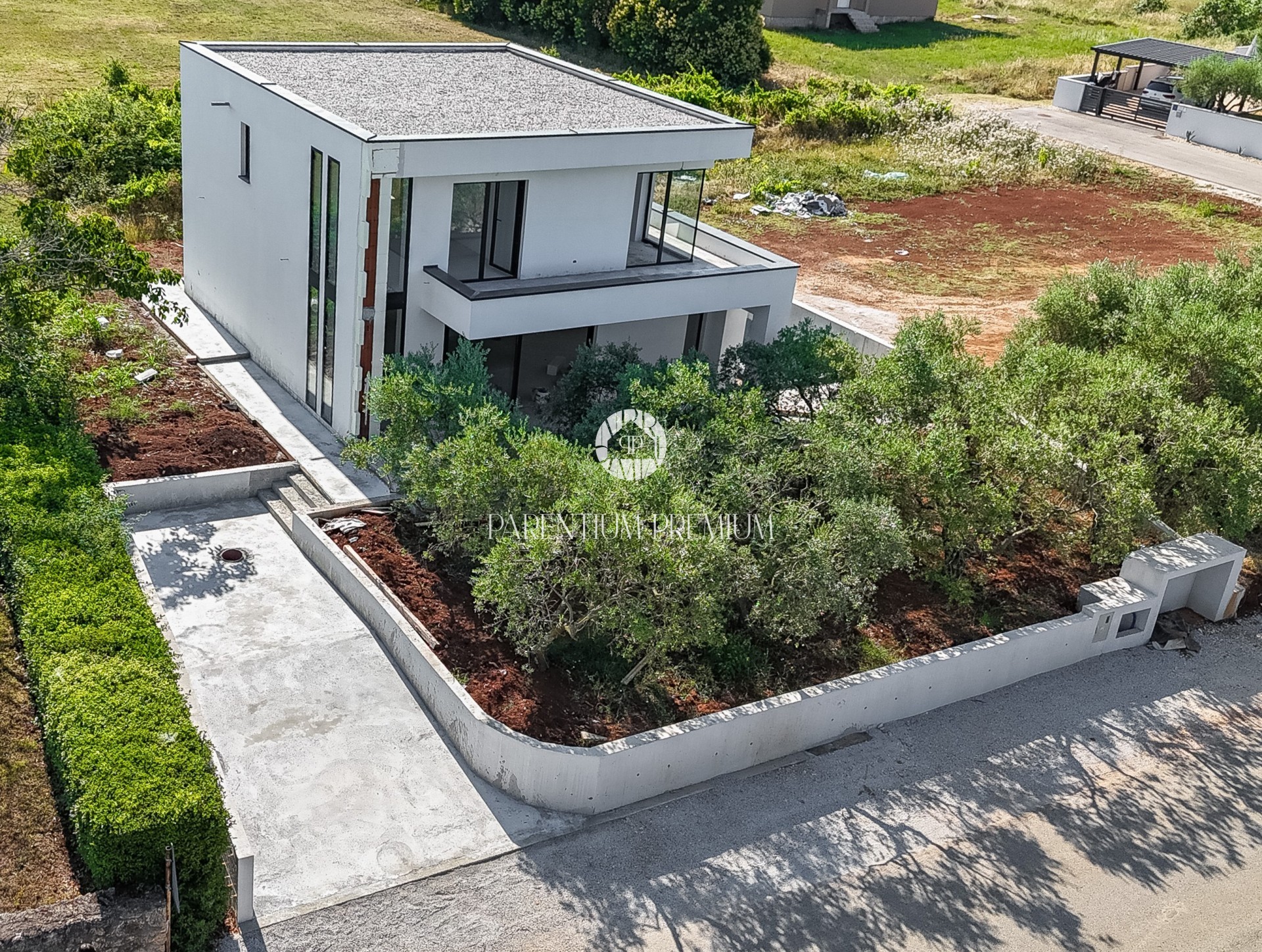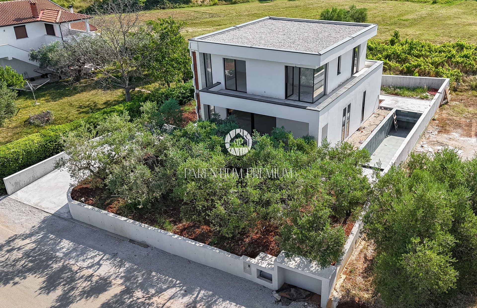 U dvorištu se nalazi bazen površine 25 m², okružen sunčalištem od kvalitetnog deckinga. Okućnica je oplemenjena mediteranskim biljem, a planirano je automatsko navodnjavanje za jednostavno održavanje. Osigurana su dva parkirna mjesta.