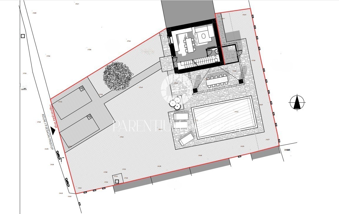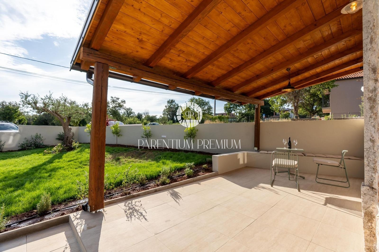 Ispred ulaza nalazi se natkrivena terasa, dok se iza kuće smjestila još jedna natkrivena terasa idealna za opuštanje i druženje. Uređeno dvorište krasi bazen sa sunčalištem, stvarajući savršeno okruženje za uživanje tijekom cijele godine. Okućnica je dodatno oplemenjena automatskim sustavom navodnjavanja, koji osigurava jednostavno održavanje zelenih površina. U dvorištu su osigurana i dva parkirna mjesta.
