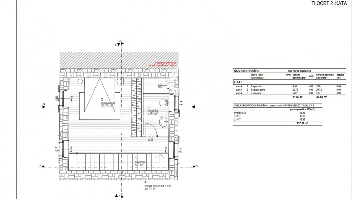 Kuća se nalazi na zemljištu ukupne površine 524 m² te se prostire na tri etaže, s ukupnom neto stambenom površinom od 137,58 m².