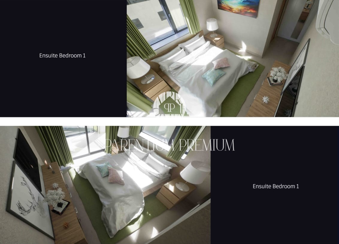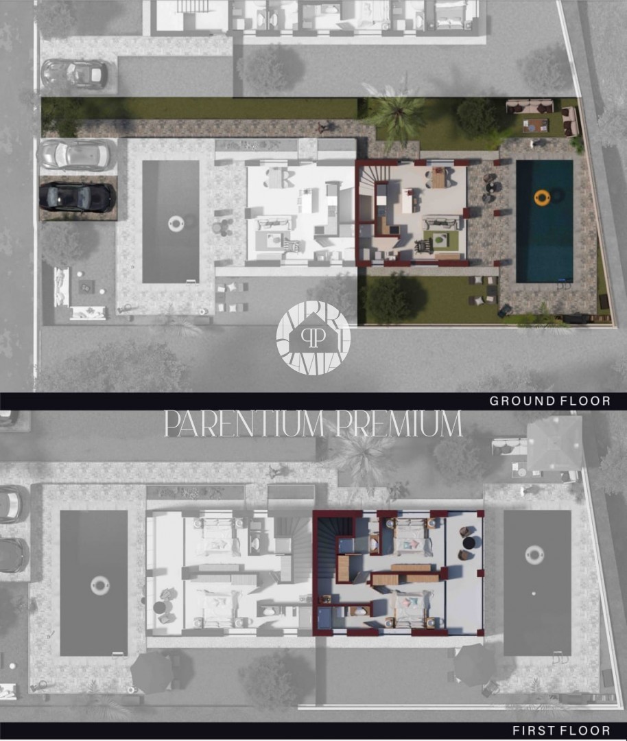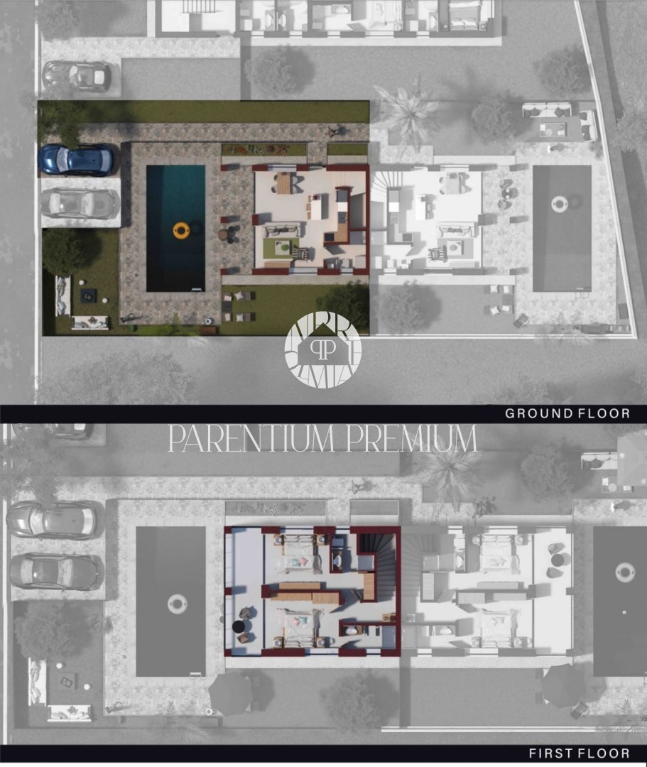 Secondo il progetto, ogni unità abitativa dispone di 105 m² distribuiti tra piano terra e primo piano, con terrazza sul tetto e giardino privato con piscina, garantendo il massimo comfort.