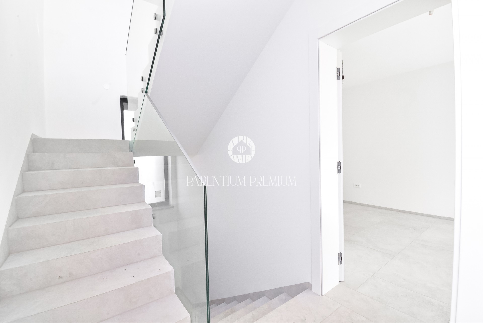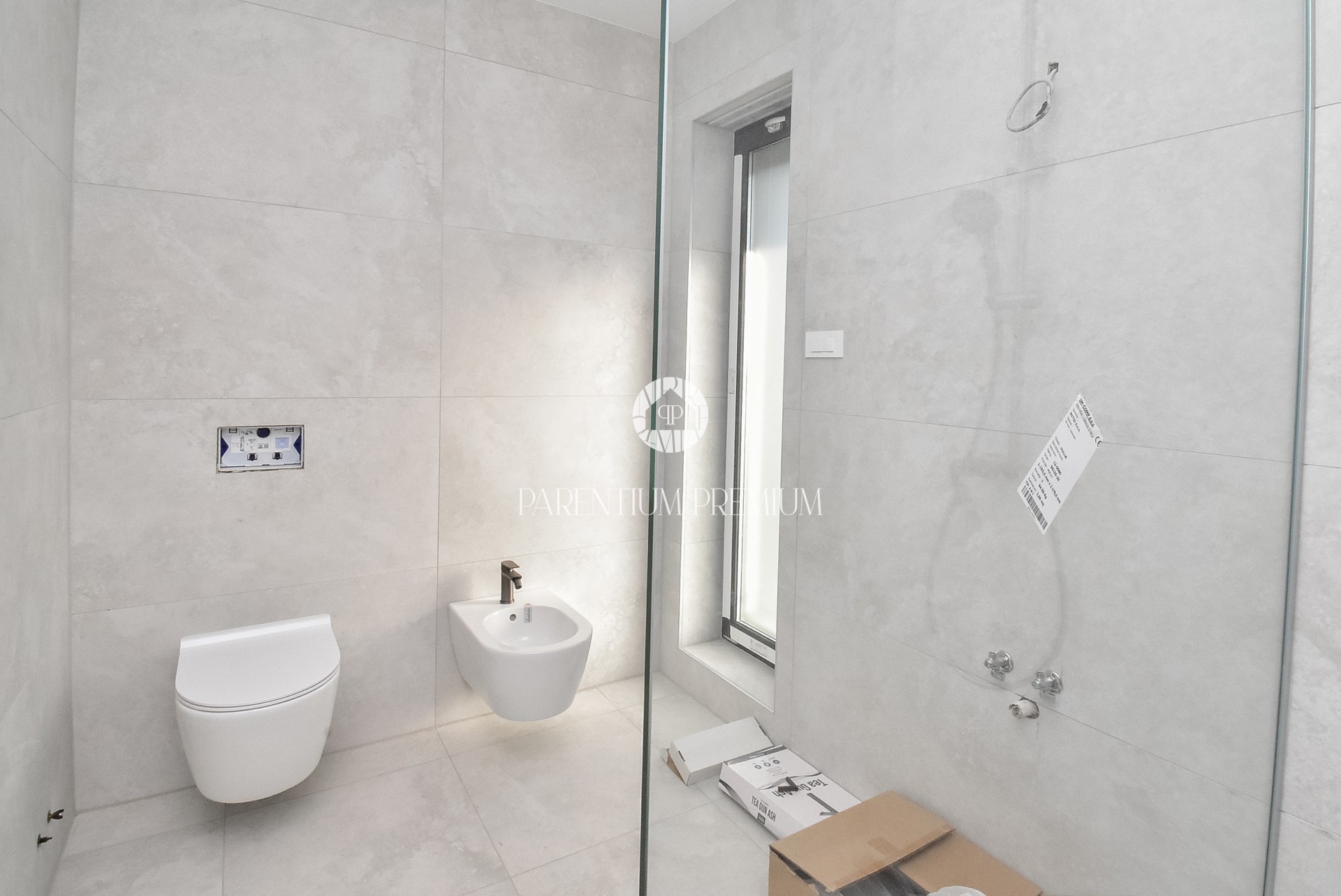 Drugo nadstropje ponuja dodatno kopalnico in večnamenski prostor, ki je lahko kuhinja, wellness ali savna, ter veliko nepokrito teraso velikosti 78 m² s pogledom na morje.