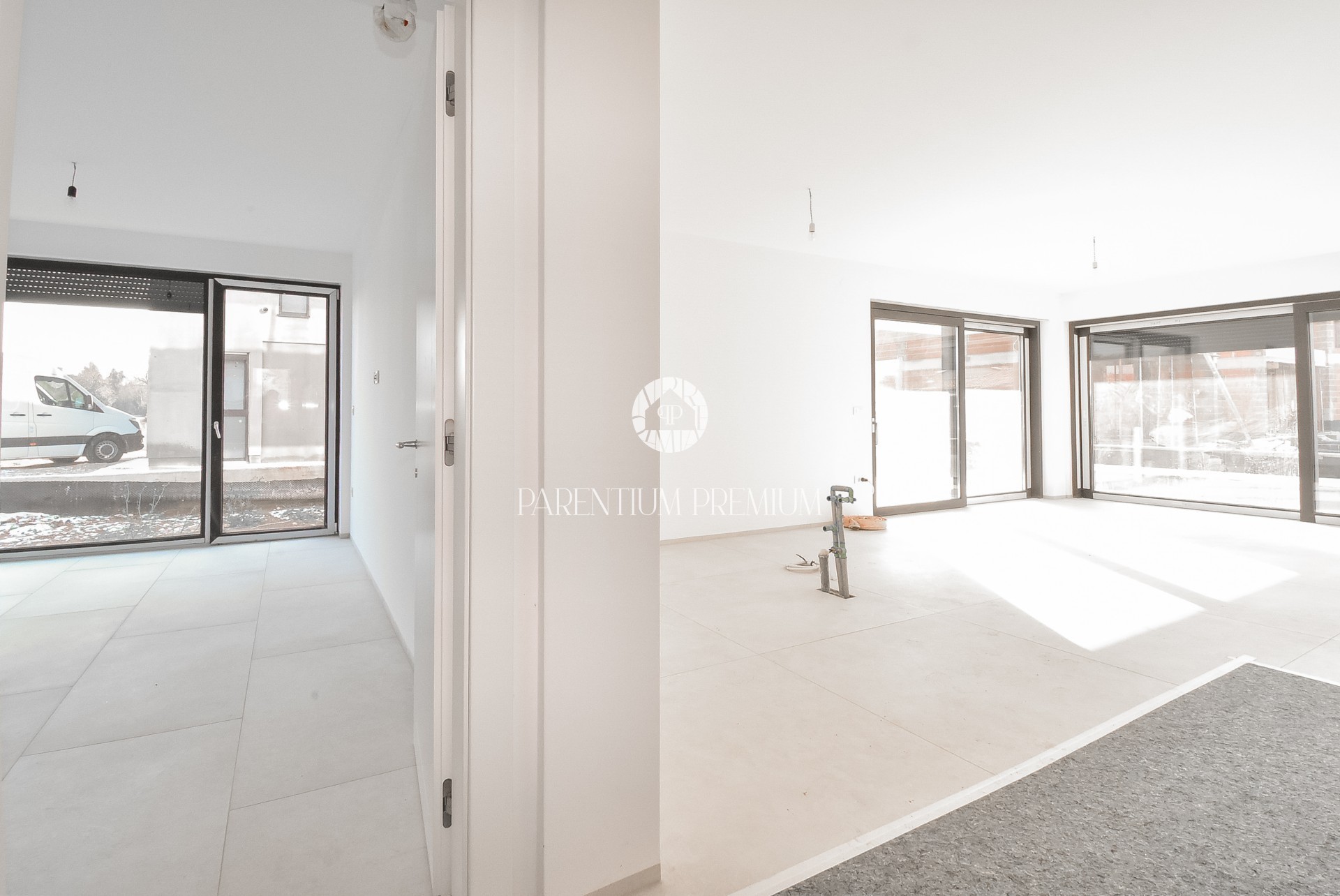V pritličju se nahajajo vhodni prostor, tehnični prostor, shramba, ena spalnica, kopalnica ter prostoren dnevni prostor s kuhinjo in jedilnico v open space zasnovi. Dnevni prostor ima izhod na pokrito teraso, sončno ploščad in bazen, kar omogoča prijetno bivanje na prostem.